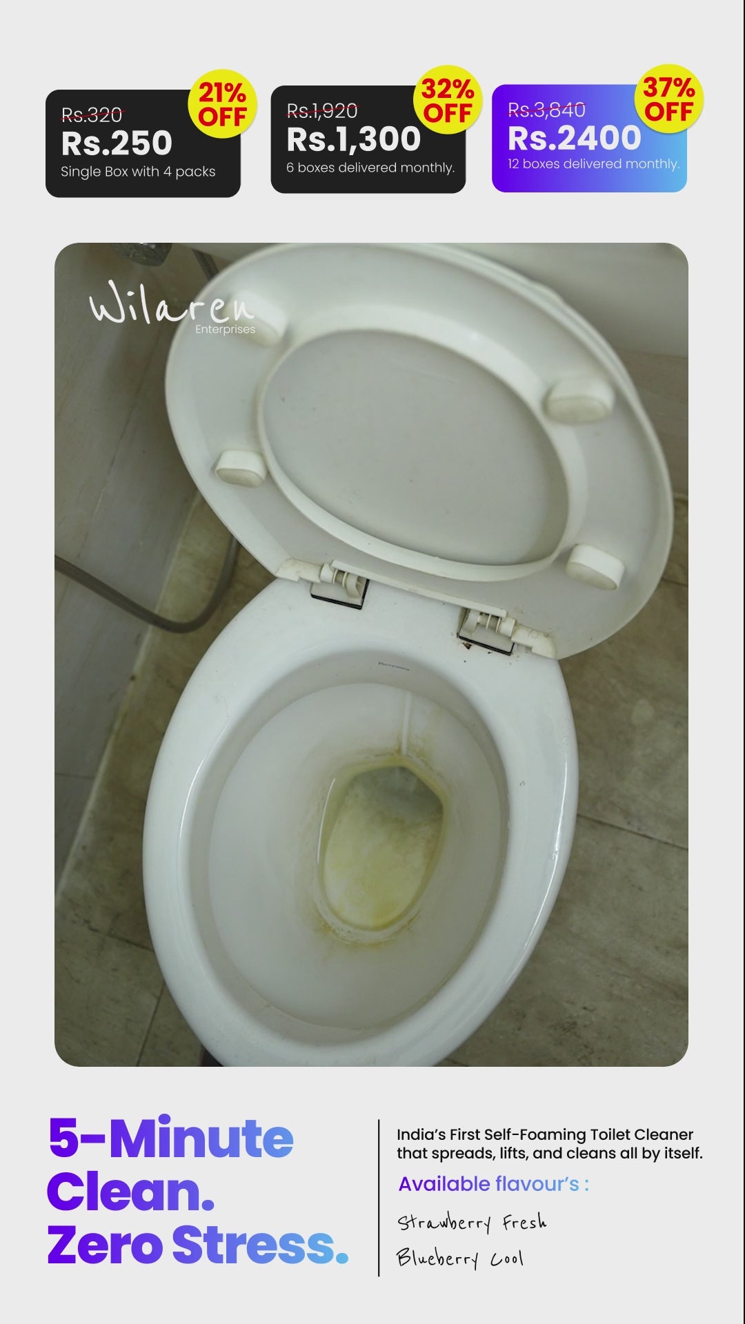 Toilet Foam Cleaner uses a self-activated foaming formulathat spreads automatically inside the toilet bowl, rim, and pipe bends to lift dirt, remove stains, and eliminate odor effortlessly.